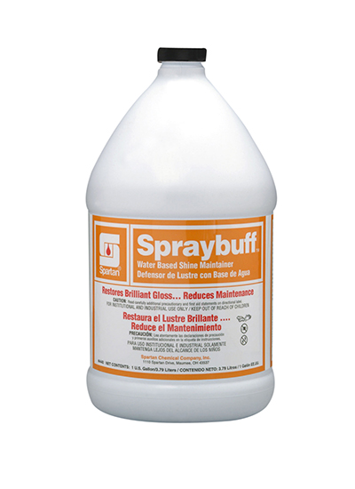 Spraybuff combina detergentes y polímeros de acabado de pisos en un producto de mantenimiento de pisos de rutina diseñado para aumentar la efectividad del pulido.